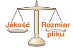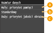 Podczas konwertowania skanowanych dokumentów do formatu JPEG można określić stopień kompresji pliku. Opcja <Mały: priorytet pamięci> zwiększa stopień kompresji i tworzy mniejsze pliki o niższej jakości obrazu. Natomiast opcja <Duży: priorytet jakości obrazu> pozwala uzyskać niższy stopień kompresji niż w przypadku standardowych plików z wyższą jakością obrazu.