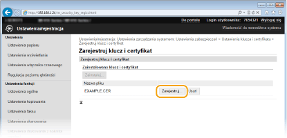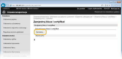 Wymagania dotyczące kluczy i certyfikatów). Można zarejestrować maksymalnie pięć par kluczy (w tym pary kluczy zainstalowane fabrycznie) i 67 certyfikatów CA (w tym 62 pary zainstalowane fabrycznie).