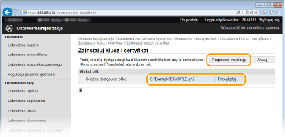 Kliknij [Ustawienia klucza i certyfikatu], aby zainstalować parę kluczy lub [Ustawienia certyfikatu CA], aby zainstalować certyfikat CA.