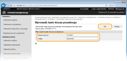 Wprowadź kolejno nazwę pary kluczy i hasło, a następnie kliknij przycisk [OK].