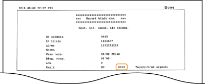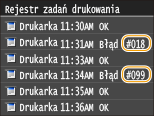 Jeśli wystąpi błąd, na przykład w przypadku nieudanego drukowania lub niemożności wysłania lub odebrania faksu bądź zeskanowanego dokumentu, w raporcie lub na ekranie <Rejestr zadań> zostanie wyświetlony odpowiadający mu trzycyfrowy kod błędu. Przyczyny i rozwiązania dla poszczególnych kodów błędu można znaleźć w poniższych źródłach. Informacje na temat drukowania raportu o błędach oraz informacji zawartych w raporcie, patrz