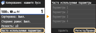 Можно добавить до четырех часто используемых комбинаций настроек копирования. Достаточно выбрать необходимую комбинацию настроек, чтобы не настраивать одни и те же параметры перед каждым копированием, например, если вы часто делаете по 5 копий, установите для параметра <Стирание рамки> значение <Вкл.> и увеличьте резкость при копировании. Можно также отобразить настройки в качестве кнопок действия на экране Главный.