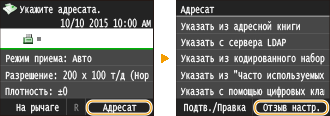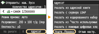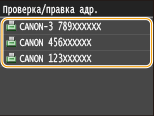 Можно выбрать адресата из списка последних трех адресатов. При указании ранее использованного адресата устройство автоматически устанавливает те же настройки факсимильной связи (например плотность), которые использовались при последней отправке факса этому адресату.