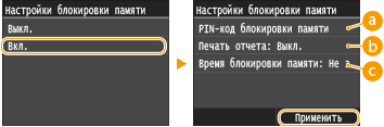 Чтобы сохранить полученные документы в памяти, установите для параметра <Настройки блокировки памяти> значение <Вкл.>. Эта функция включает дополнительные настройки, например настройку безопасности, предусматривающую обязательный ввод пароля для разблокирования функции, а также настройку времени, указывающую период в течение дня, когда принятые документы сохраняются в память.