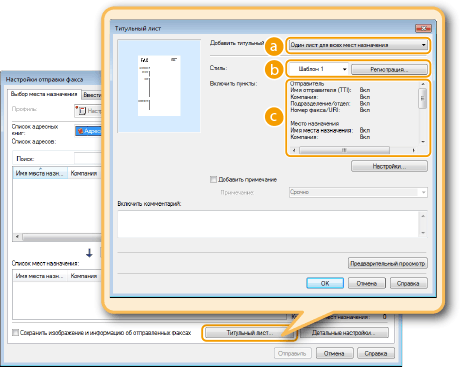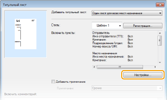 Можно добавить к отправляемому документу титульный лист. Выберите один из трех предварительно настроенных шаблонов титульного листа, предоставляемых драйвером факса, или создайте свои собственные настраиваемые титульные листы. Для просмотра дополнительных сведений нажмите [Справка] на экране драйвера факса.