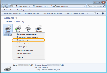 Щелкните правой кнопкой мыши значок драйвера факса для этого аппарата и выберите пункт [Настройка печати].
