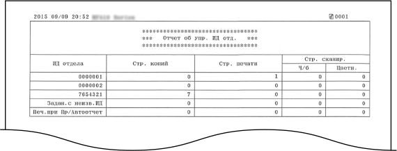 Если включена функция управления именем подразделения, для проверки общего числа распечаток для каждого элемента <ИД отдела> можно напечатать отчет об управлении именем отдела. Проверка общего числа распечаток позволяет оптимизировать управление закупками бумаги и картриджа с тонером.