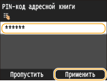 Если для адресной книги задан PIN-код, во время импорта отображается экран <PIN-код адресной книги>. Введите PIN-код адресной книги и коснитесь элемента <Применить>. Для отмены импорта данных адресной книги коснитесь элемента <Пропустить>.