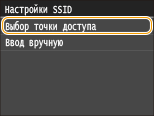 Если беспроводное подключение настраивается путем выбора беспроводного маршрутизатора, для метода проверки подлинности WEP устанавливается значение <Открытая система>, а для метода шифрования WPA/WPA2 — значение <Авто> (AES-CCMP или TKIP). Чтобы выбрать значение <Общий ключ> для проверки подлинности WEP или значение <AES-CCMP> для шифрования WPA/WPA2, необходимо настроить подключение, используя метод ввода вручную ( Настройка подключения путем детального задания параметров).