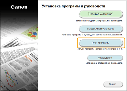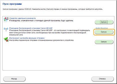 Нажмите [Запуск] для [Помощник беспроводной установки Canon MF/LBP].