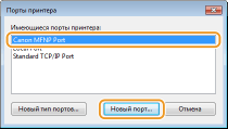 Выберите [Canon MFNP Port] в качестве значения параметра [Имеющиеся порты принтера] и нажмите [Новый порт].