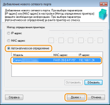 Выберите [Автоматическое обнаружение], выберите найденный аппарат и нажмите [Далее].
