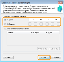 Нажмите кнопку [Обновить]. Если проблему не удается устранить, выберите [IP-адрес] или [MAC-адрес], введите IP-адрес или MAC-адрес аппарата (Просмотр параметров сети) и нажмите [Далее].