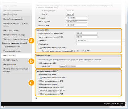 Установите флажок для динамического обновления записей DNS при каждом изменении IP-адреса аппарата. При указании интервала между обновлениями задайте значение времени в текстовом поле [Интервал динамического обновления DNS]. [Настройки mDNS][Использовать mDNS]