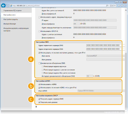Установите флажок для динамического обновления записей DNS при каждом изменении IP-адреса аппарата. Чтобы задать типы адресов, которые необходимо зарегистрировать для DNS-сервера, установите этот флажок для [Регистрация адреса вручную], [Регистрация адреса с учетом состояния] или [Регистрация адреса без учета состояния]. Чтобы указать интервал между обновлениями, задайте значение времени в текстовом поле [Интервал динамического обновления DNS]. [Настройки mDNS][Использовать mDNS]