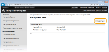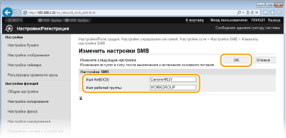 SMB (блок сообщений сервера) представляет собой протокол для общего доступа к ресурсам (например, файлам и принтерам) для нескольких устройств в сети. Аппарат использует SMB для сохранения сканированных документов в общую папку. В зависимости от особенностей сети, возможно, потребуется настроить имя NetBIOS и имя рабочей группы.