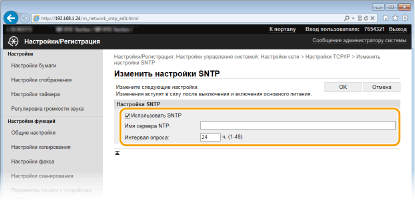 SNTP аппарата поддерживает серверы NTP (версия 3) и SNTP (версии 3 и 4).