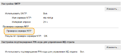 Проверка связи с сервером NTP/SNTPМожно просмотреть состояние связи с зарегистрированным сервером, нажав [Настройки/Регистрация]