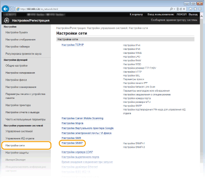 Простой протокол сетевого управления (SNMP) представляет собой протокол для мониторинга и контроля устройств связи в сети с помощью базы данных MIB. Аппарат поддерживает версию протокола SNMPv1 и версию с расширенными функциями безопасности SNMPv3. Статус аппарата можно проверить с помощью компьютера при печати документов или использовать для этого Удаленный ИП. Можно разрешить использование SNMPv1 или SNMPv3 по отдельности или одновременно. Укажите настройки для каждой версии в соответствии с особенностями сетевой среды и конкретными задачами.