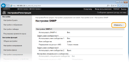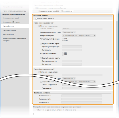 Если включены обе версии SNMP, рекомендуется задать для разрешений SNMPv1 на доступ к объектам MIB значение [Только чтение]. Разрешение на доступ к объектам MIB можно задать отдельно в SNMPv1 и SNMPv3 (а также для каждого из пользователей в SNMPv3). При выборе [Чтение/запись] (разрешение на полный доступ) в SNMPv1 снижает эффективность функций безопасности, которые отличают протокол SNMPv3, поскольку большинство параметров аппарата можно контролировать посредством SNMPv1.