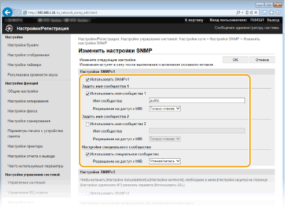 Если обе версии SNMP отключены, некоторые функции аппарата будут недоступны (например, получение сведений об аппарате посредством драйвера принтера).