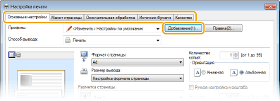 Щелкните вкладку [Основные настройки], [Макет страницы], [Окончательная обработка], [Источник бумаги] или [Качество] и укажите необходимые параметры печати на каждой вкладке.