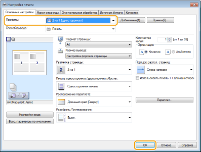 Необходимость каждый раз указывать параметры печати, например, «1-сторонняя печать на бумаге формата A4 в альбомной ориентации», отнимает время. Если зарегистрировать часто используемые комбинации параметров в качестве «профилей», то для настройки печати необходимо будет выбрать только профиль из списка. В этом разделе описана процедура регистрации профилей и их использование.
