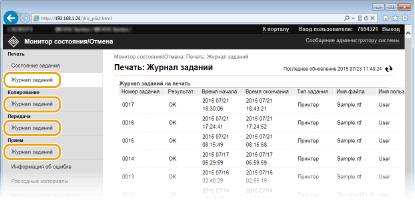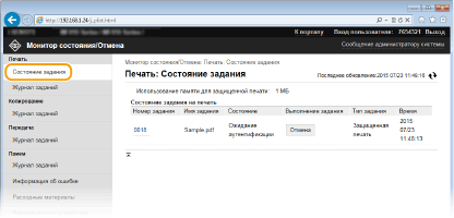 Нажмите [Номер задания] на документах, печать которых была приостановлена, или для которых используется безопасная печать, чтобы просмотреть подробную информацию. Можно просмотреть имя пользователя и количество страниц печатаемого документа.