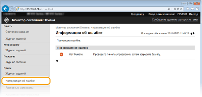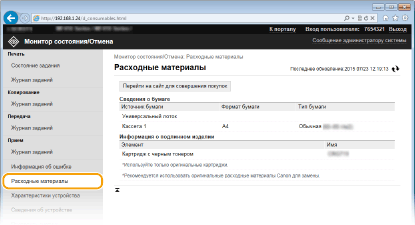 Отображение формата и типа бумаги для источника бумаги, номера модели картриджа с тонером и других сведений. Для отображения этой страницы можно также нажать [Проверить сведения о расходных материалах] на странице
