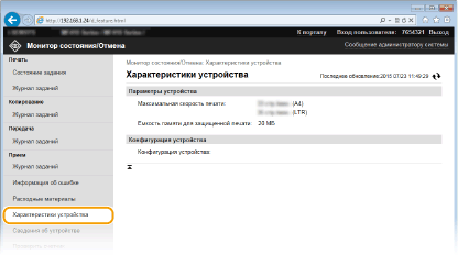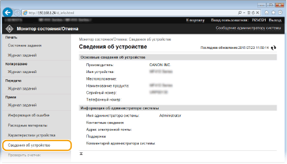 Отображение сведений об аппарате и администраторе системы. Эти сведения можно найти в [Управление системой] на странице [Настройки/Регистрация].