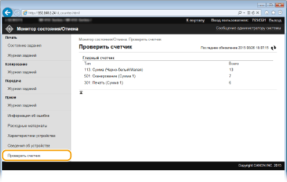 Отображается общее число страниц, напечатанных с использованием функций печати, копирования и факса.
