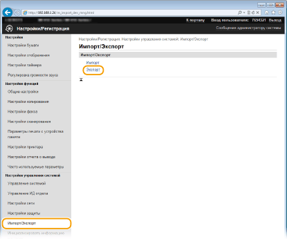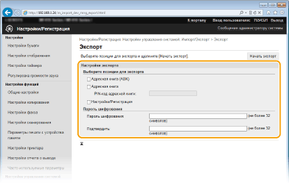 Если установлен флажок [Адресная книга (ABK)], невозможно экспортировать настройки аппарата одновременно с данными адресной книги.