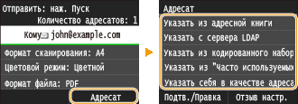 Если коснуться элемента <Указать с сервера LDAP> или <Указать себя в качестве адресата>, место назначения будет выбрано как место назначения <Кому>.