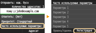 Чтобы изменить или удалить зарегистрированные настройки, перейдите к пункту <Сканиров-е>  <Электронная почта>/<И-факс>/<Файл>  <Часто используемые параметры>  <Правка/Удален.>  <Правка> или <Удалить>, затем выполните указанные ниже шаги.