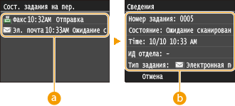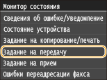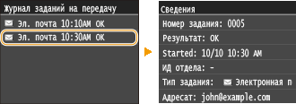 ![]() <Журнал заданий на передачу>Отображает список отправленных документов. <OK> отображается, если документ удалось отправить; <Ошибка> отображается, если не удалось отправить документ из-за отмены печати или возникновения какой-либо ошибки.