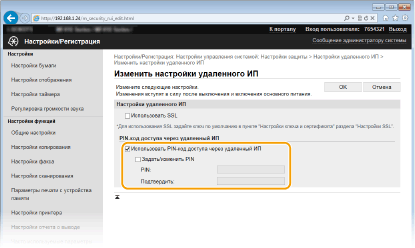 Установите флажок [Использовать PIN-код доступа через удаленный ИП] и установите PIN-код.