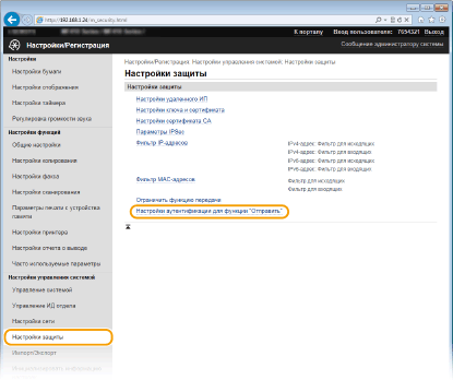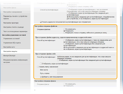 Если для параметра [Отправка файлов] задано значение [Разрешить только отправку себе или в указанную папку]