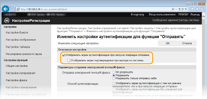 Для авторизации на сервере используются имя пользователя и пароль, введенные на экране входа в систему авторизованной отправки. Если установлен флажок [Отображать экран аутентификации], отображается экран аутентификации с именем пользователя и паролем, введенными при отправке данных.