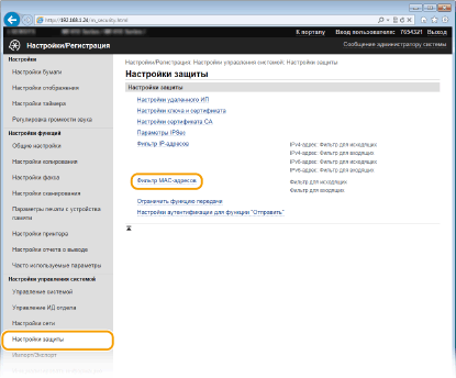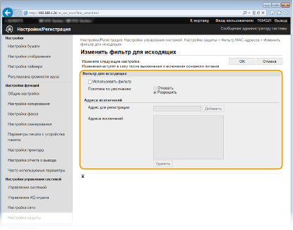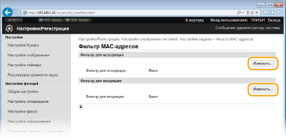 При неправильном вводе MAC-адресов доступ к аппарату из Удаленного ИП может быть невозможен. В этом случае необходимо указать для <Фильтр MAC-адресов> значение <Выкл.>. Фильтр MAC-адресов
