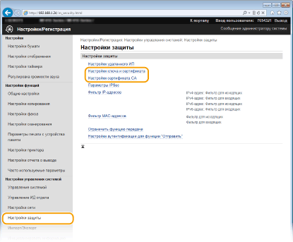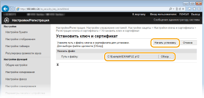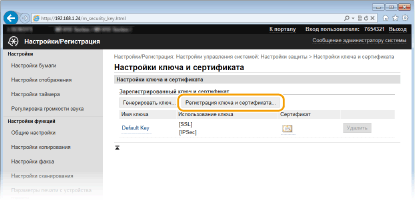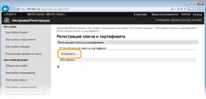 Щелкните [Настройки ключа и сертификата] для установки пары ключей или [Настройки сертификата CA] для установки сертификата CA.