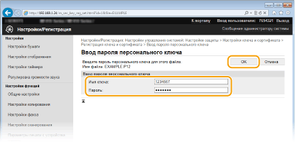 Пары ключей и цифровые сертификаты выдаются центром сертификации (CA) для использования на аппарате. Хранить и регистрировать эти файлы можно, используя Удаленный ИП. Убедитесь, что пара ключей и сертификат соответствуют требованиям аппарата (