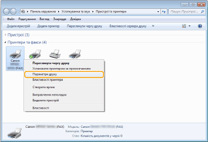 Клацніть правою кнопкою миші піктограму драйвера факсу для цього апарата та виберіть елемент [Настройки друку].