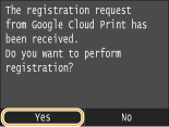 Апарат також можна зареєструвати з мобільного пристрою або браузера Google Chrome*. Перед завершенням реєстрації на дисплеї апарата відображається наведений нижче екран підтвердження. Натисніть <Yes>, щоб завершити реєстрацію.