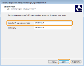 Введіть IP-адресу або ім’я DNS апарата та натисніть кнопку [Далі].