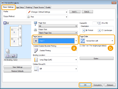 Можна друкувати кілька сторінок на одному аркуші. Наприклад, на одному аркуші можна надрукувати чотири чи дев’ять сторінок, вибравши параметр [4 on 1] (4 на 1) або [9 on 1] (9 на 1). Використовуйте цю функцію, щоб заощадити папір або переглянути документ у вигляді мініатюр.