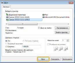 Виберіть драйвер принтера для цього апарата та натисніть кнопку [Настройки] або [Властивості].