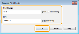 Введіть [Document Name] (Назва документа), [User Name] (Ім’я користувача) і [PIN] (PIN-код), а потім натисніть кнопку [OK].