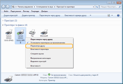 Клацніть правою кнопкою миші піктограму драйвера принтера для апарата та виберіть елемент [Настройки друку].