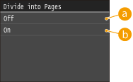 Якщо вибрати JPEG у пункті <File Format> і спробувати відсканувати документ на склі експонування, можна відсканувати лише одну сторінку. Щоб відсканувати весь багатосторінковий документ за раз, використовуйте пристрій подавання. Кожна сторінка документа зберігається як окремий файл. Якщо вибрати TIFF або PDF, багатосторінкові документи можна сканувати або на склі експонування, або за допомогою пристрою подавання. У такому разі використовуючи Поділ документа на кілька файлів посторінково можна зазначити, щоб весь відсканований документ зберігався як один файл або як кілька файлів посторінково.