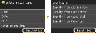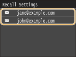 Можна вибрати адресата з останніх трьох одержувачів. Якщо вказати попереднього адресата, апарат встановить ті самі параметри сканування (зокрема, насиченість), що використовувалися минулого разу для надсилання документів цьому адресату.